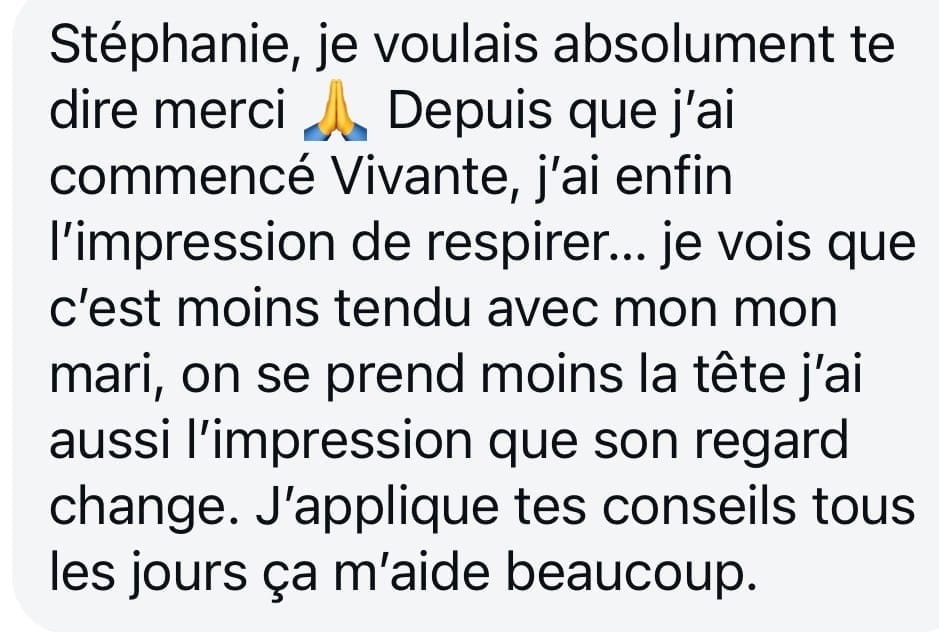 Oui, parce que tu ne travailles pas seulement sur ton couple, mais sur toi. En retrouvant ta clarté et ton équilibre intérieur, tu changes automatiquement ta manière d’aborder la relation et les échanges avec ton partenaire. Bien évidement, cela demande de réaliser le travail proposé dans Vivante.